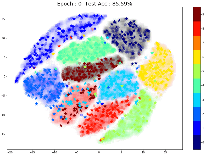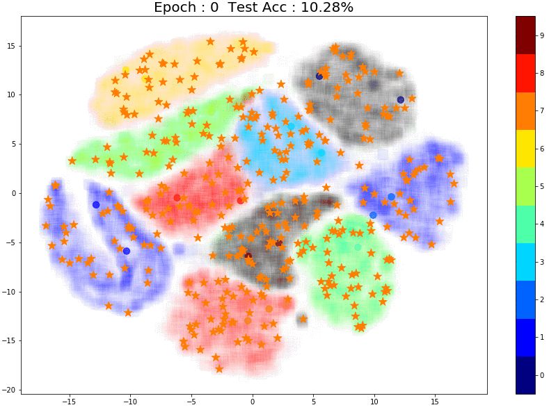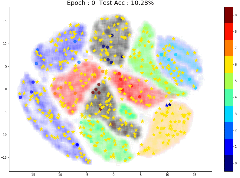 - The small stars that keep moving are the pseudo labels that the model assigns for the unlabeled images for each epoch. (For each epoch I used ~750 randomly sampled unlabeled images to create the plot)
